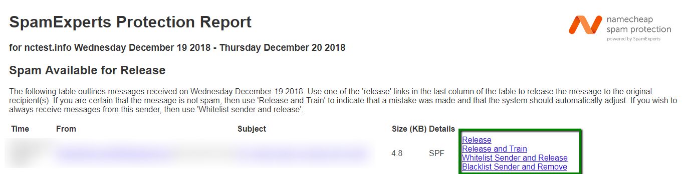 • Release and train from quarantine option will deliver the email to the recipient and train it as not spam in the SpamExperts system.